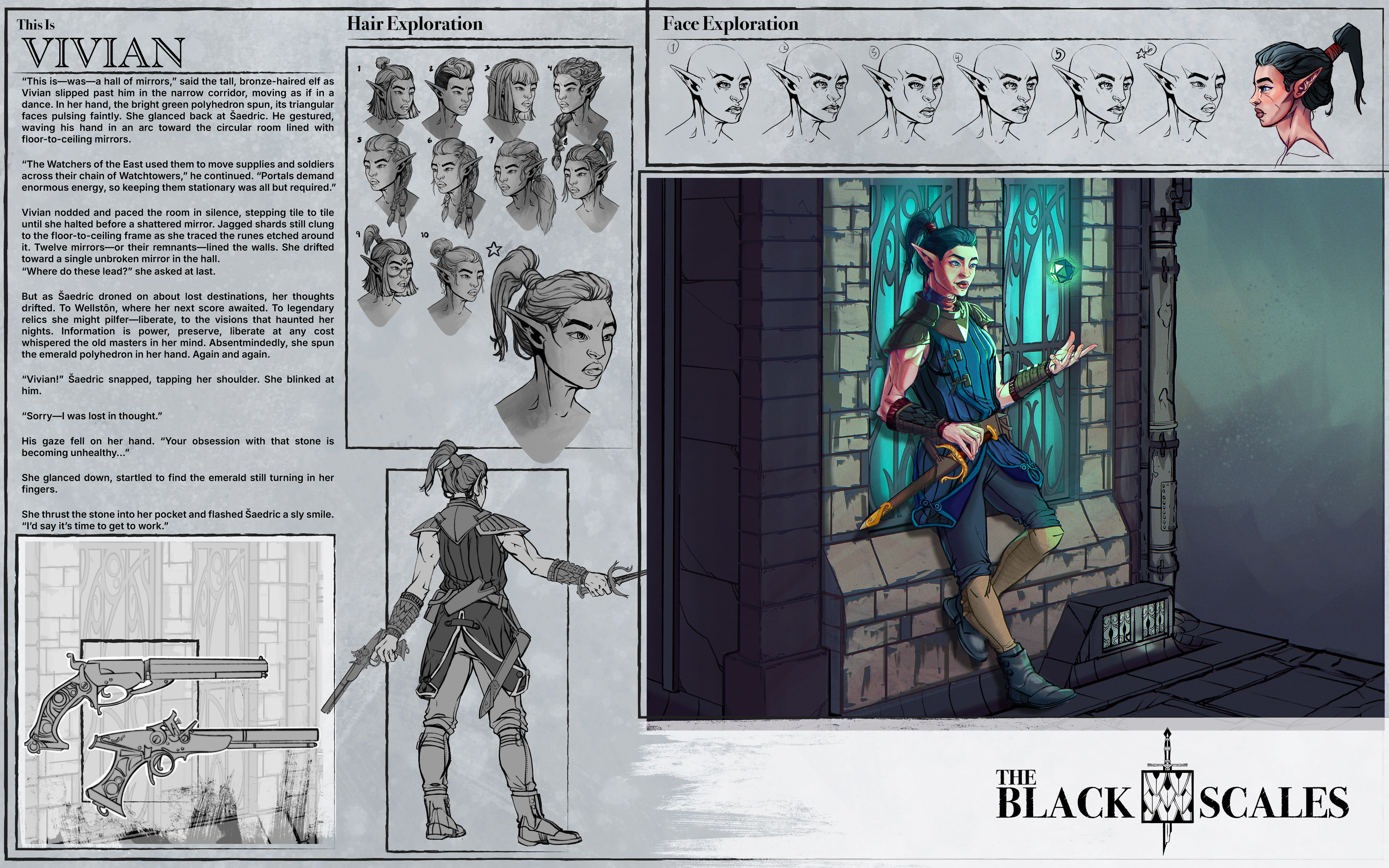 This piece is part of my ongoing fantasy worldbuilding project, exploring the Black Scales thieves’ guild and its colorful rogues. My goal with Vivian was to combine expressive character design with narrative-driven illustration, showing not just her look, but her character: the risk, allure, and confidence a master thief such as herself has. She who lives one step ahead of both her rivals and her pursuers.